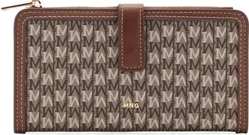 Monogram logo jacquard and smooth faux-leather create textural interplay on a slender wallet featuring ample compartments for securing your cards, cash and coins.