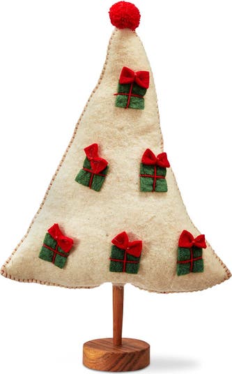 Make a statement with this large Present Tree. Made from felt, polyester, and wood, this tree features a unique design with green presents and a red pom-pom topper. Perfect for creating a festive centerpiece.