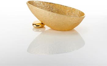 An asymmetrical nest like textured bowl, resting on a polished gold rock. Original and decadent design , handcrafted by artisans, this glamorous and bold design is a one of a kind centerpiece . Use to serve candy or nuts or simply as a decorative accent. Each of our creations is designed in our San Francisco studio. Master craftsmen using centuries old technique of sand casting create the original mould and skilled artisans hand create every piece, with pride, in our family owned factory.