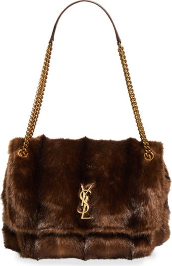 An antiqued YSL monogram authenticates a glamorous shoulder bag shaped from plush faux mink and packed with pockets, inside and out. A chain-and-leather pull-through strap can be worn doubled for shoulder carry or extended for crossbody style.
