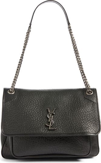 An antiqued YSL monogram authenticates a timeless shoulder bag shaped from tumbled calfskin leather and packed with pockets, inside and out. A chain-and-leather pull-through strap can be worn doubled for shoulder carry or extended for crossbody style.