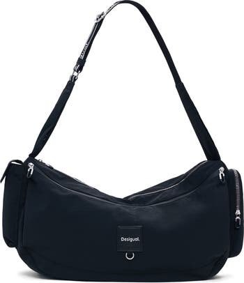 A logo patch with D-ring hardware subtly brands this duffle-inspired bag made of durable nylon and equipped with multiple organizational pockets.