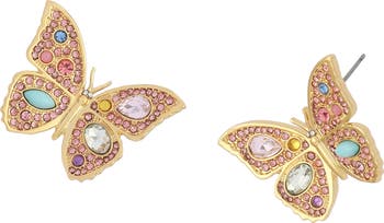 Multicolor pavé crystals sparkle across these oversized butterfly stud earrings designed in a playful statement scale.