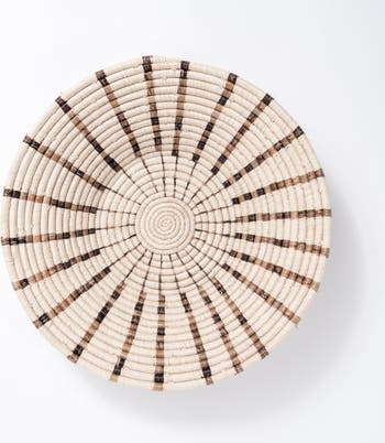 - Made from all natural, sustainably sourced raffia and banana fibers All synthetic AZO free dyes Hanging loop on back allows basket to be wall decor in addition to tabletop use Weavers hand make each basket from home while tending to other household duties. Baskets can take days to weeks to complete with artists weaving 3 or so hours per day while balancing other responsibilities. No two baskets are identical - there will be slight variations in size and color from the one shown due to the handmade nature of each product. Each basket is both special and unique. HANDMADE IN UGANDA APPROXIMATE SIZE: 17" x 5"