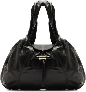 Twisted shoulder straps and a voluminous profile add dimension and fluid movement to a spacious hobo bag accented with geometric logo hardware for a signature flourish.