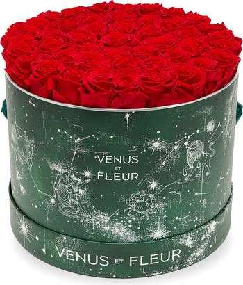This arrangement features 42-49 stunning Eternity Roses handpicked in Ecuador and set in a festive, zodiac-themed round box. It is an ideal arrangement for elevating any small space and serves as a perfect gift. An Eternity Rose is a luxury rose that can last more than a year with proper care.
