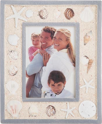 - Designed to hold a standard 5x7 inch photograph in portrait orientation, this frame offers a generous mat border that showcases the shell and sand detailing. It displays well on mantles, dressers, end tables, bookshelves, and office desks without crowding the surface.