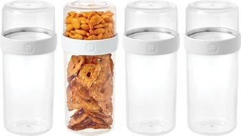 - DUAL-LOCKING CAP - Designed to keep your favorite snacks fresher for longer, the iDesign Large Stack 'n Snack Containers make on-the-go snacking even easier; The innovative dual-locking silicone cap rests in the middle and seals in freshness to the top and bottom container; This leakproof design prevents unwanted spills and stores a variety of foods for convenience and versatility; Set of 4