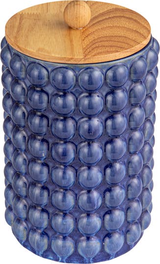 Large Stoneware Canister with Raised Dots and Wood Lid and Reactive Glaze, Navy Color and Natural