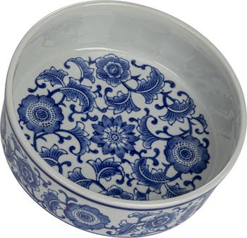 - A large and stylish pet bowl that features a stoneware material and a blue and white design