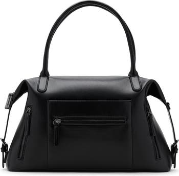 Polished buckles and zippered pockets highlight the voluminous profile of a structured bag shaped from smooth faux leather and suspended from an optional crossbody strap for hands-free wear.