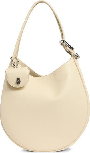 Glinting hardware stands out against the richly pebbled leather on a crescent-shaped shoulder bag designed with a spacious interior and removable turnlock pouch for optimal organization.