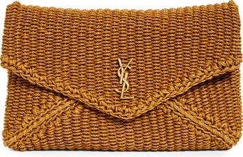 Woven raffia adds summery texture to this plump clutch finished with the label's signature Cassandre hardware gleaming on the envelope flap.