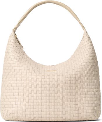 A woven nylon exterior brings textural intrigue to a spacious shoulder bag furnished with a removable pouch for easy organization.