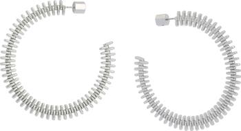 Embrace industrial edge with these large hoop earrings designed with detailed zipper teeth in polished silvertone plate.
