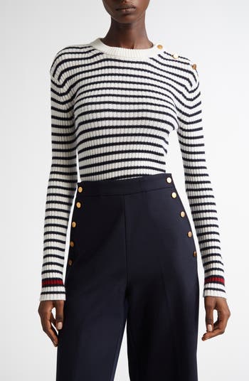 A trio of goldtone buttons gleam at the shoulder of this striped sweater knit from soft virgin wool in a figure-flattering fit that's perfect for layering.
