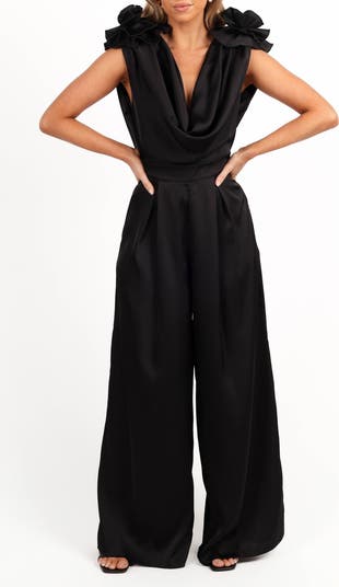 This black-satin jumpsuit exudes modern elegance and explosive dimension with floral appliqués at the shoulders, a plunging cowl neck and pleated wide legs.