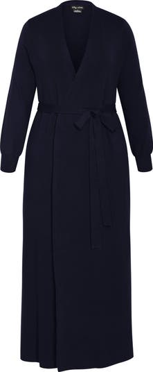 A defining tie belt shapes the silhouette of this soft and sophisticated sweater-dress made with a wrapped bodice.