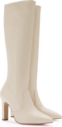 A pointy toe and slender block heel balance a rich leather boot set on a well-cushioned footbed for lasting comfort.