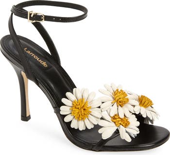 Captivating floral appliqués lend a dose of whimsy to the vamp of a leather sandal balanced by a square toe and tapered heel.