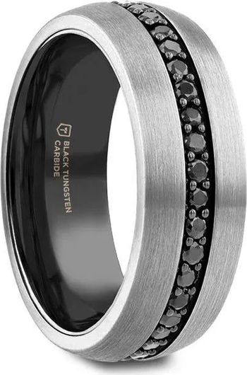 The Pilot Gunmetal Tungsten Ring with Black Sapphires has style that's out of this world. Fly him to the moon and back with your love and this elegant men's wedding band. The brushed finish on this 8mm gunmetal tungsten ring complements the glistening row of round-cut black sapphires like a tailored tuxedo jacket.