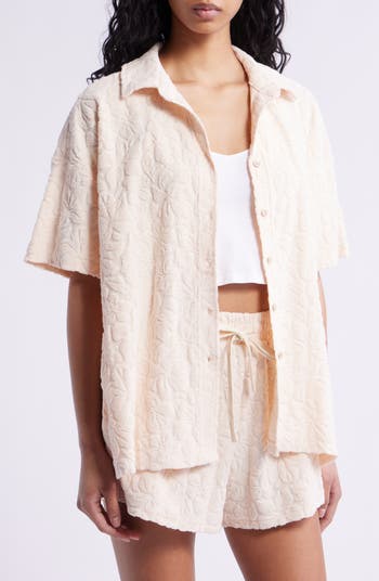 Textured terry flowers bring tropical appeal to this relaxed cotton-blend button-up shirt that's perfect for post-beach activities.