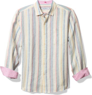 Yarn-dyed stripes in sunfaded hues bring a tranquil, beachy look to a breathable sport shirt of pure linen, distinguished with print contrast under the cuffs.