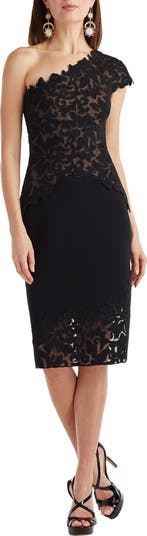Make a statement in this sleek one-shoulder cocktail dress featuring intricate laser-cut detailing and a curve-skimming silhouette that's pure elegance.