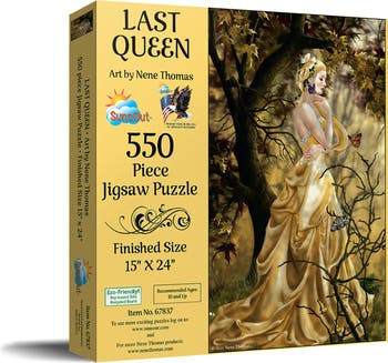 Step into a world of breathtaking fantasy with the Last Queen 550 piece jigsaw puzzle by SunsOut Puzzles. Showcasing the exquisite artwork of Nene Thomas, this puzzle transports you to a mystical realm where beauty knows no bounds. Not only is it a compelling challenge designed for adults seeking relaxation, but it's crafted with precision featuring durable interlocking pieces made of high-quality recycled cardboard, providing seamless fitting and enhanced puzzling pleasure. This masterpiece, made with pride in the USA, embodies SunsOut Puzzles' commitment to quality and American craftsmanship, delivering high manufacturing standards accompanied by their exceptional customer service. Its environmentally friendly design adds another layer of appeal, crafted utilizing the finest recycled cardboard and soy-based inks to produce vibrant, lasting colors. The Last Queen puzzle serves not only as a pastime; it’s a celebration of artistry, featuring fully licensed artwork from renowned artist Nene Thomas and displaying a beautiful narrative. As a proud owner of SunsOut's Last Queen puzzle, you support environmentally responsible practices, making your puzzle enjoyment guilt-free. Elevate your puzzle collection and admire the intricate details as you assemble each piece, immersing yourself in the enchanting world of the Last Queen.