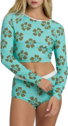 Surf, swim and sunbathe in this cropped rashguard that’s all about tropical prints and just the right amount of extra coverage.