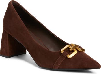 Chunky chain hardware and a sculptural flare heel remix the silhouette of this soft suede pump.