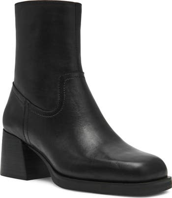 A chunky, stacked heel adds walkable height to a leather bootie featuring a squared-off toe and full-length side zipper.