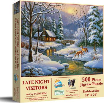 Dive into the serene beauty of winter with the Late Night Visitors 500 piece jigsaw puzzle. Crafted with precision and renowned for interlocking seamlessly, every piece of this jigsaw puzzle invokes a captivating scene by artist Sung Kim that explores an enchanting landscape filled with peace and tranquility. Made in the USA by SunsOut, a woman-owned small business, this durable puzzle delivers the perfect challenge with its completed size of 18" x 24", showcasing nature's quiet elegance. The full-color display box adds an extra touch of elegance, making it a perfect gift crafted using high-quality recycled cardboard and soy-based inks which showcases their commitment to quality and environmental conservation. Furthermore, SunsOut Puzzles goes beyond craftsmanship and offers a worry-free guarantee ensuring that any issues with the puzzle pieces can be promptly resolved by their dedicated customer service team, allowing you to focus solely on your puzzle-solving adventure. As such, the Late Night Visitors jigsaw puzzle brings warmth and artistic beauty into your home in a sustainable manner—a delightful blend of art, nature, and mindful production. Approach your winter evenings with this proudly American brand that embodies the spirit of artistic expression and community.