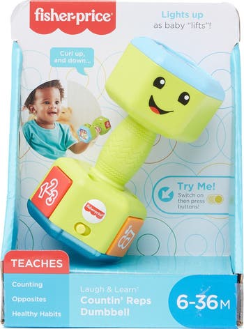[This review was collected as part of a promotion.] How cute is it when baby is playing with dumbbell & looks like they are exercising. Easy for baby to grab & hold & push up with it. Has 2 push buttons for baby to interact with when playing. Keeps baby entertained, the sounds isn't as loud like most fisher price toys. Has blue light at the end to catch baby attention. Only has one language.