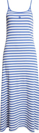 A single embroidered bloom adds a shot of signature style to a ribbed stretch-cotton dress striped in shades of sea and sky.