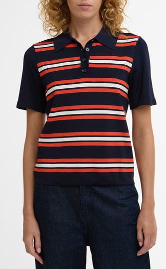Zesty stripes ready you for the day's adventure in this trim and stretchy polo framed by solid sleeves and trim.