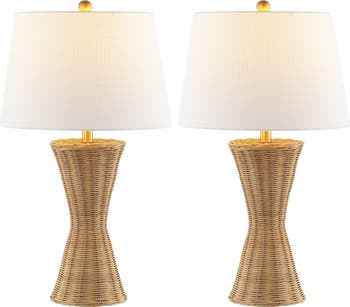 - Bohemian touches include not just the woven rattan lamp base but also the lamp's coastal linen shade