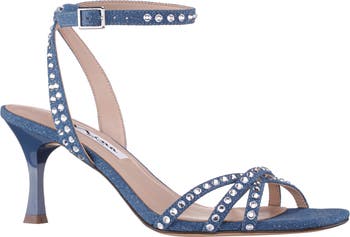 Sparkling jewels enrich the slender straps on an occasion-ready sandal framed by an angular square toe and tapered heel.