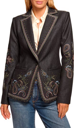 Add a touch of tailored elegance with this fitted blazer featuring intricate embroidery that blends sophistication with a hint of bohemian charm.