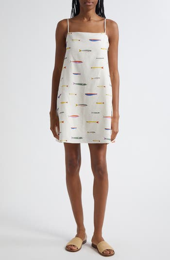 Get ready to reel in the compliments—a school of colorful sardines swims across this sunny-day-ready minidress cut from light and airy linen in a relaxed shift silhouette.