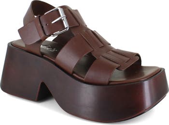 A soaring platform and block heel add scene-stealing height to a retro-inspired leather sandal fashioned with a squared-off toe for trendsetting appeal.