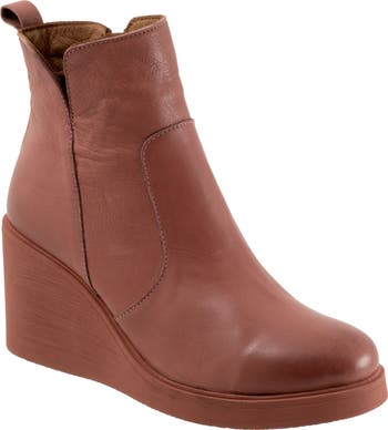 A subtle platform and integrated wedge heel add walkable height to a sleek leather bootie furnished with a cushioned footbed and built-in arch support for lasting wear.