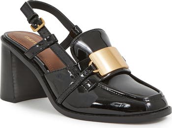 Goldtone plaque hardware and a loafer-inspired silhouette add contemporary sophistication to a patent-leather slingback pump set on lightly flared block heel.