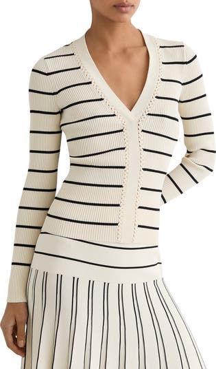 Braided trim adds subtle detail to this crisply striped top that owes its figure-skimming fit to the stretchy ribbed knit made from fine, lightweight yarns.