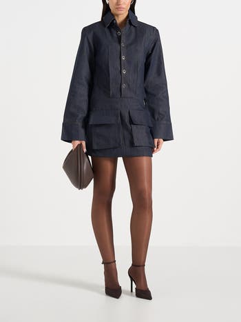 Designed in structured denim, the silhouette balances utilitarian influence with modern design. Shoulder pad detailing adds definition and a sculpted shape, while denim feature buttons enhance the contemporary feel. Front cargo pockets bring a functional, utility-inspired edge, complemented by front pleats that introduce subtle volume. Finished with contrast stitching and a ruched skirt detail, this look delivers clean definition with added texture and movement.