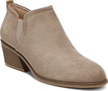 Flexible construction and a cushioned footbed yield walkable comfort in a low bootie with a stacked heel and almond toe for a dash of Western-inspired charm.