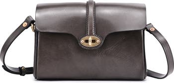 A vintage inspired genuine leather crossbody with a fold over flap and twist lock closure for secure organization. Two divided compartments and multiple interior pockets keep essentials easily accessible.