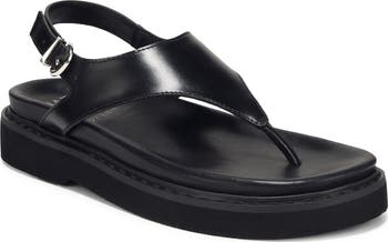 A center toe post and adjustable slingback strap offer a secure fit on a leather platform sandal featuring a cushioned footbed with enhanced flexibility and shock absorption.