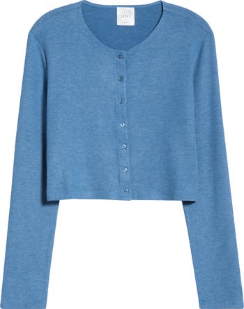 A soft knit cardi is offered in a boxy fit for a look that works as a lightweight outer layer or a simple solo player.