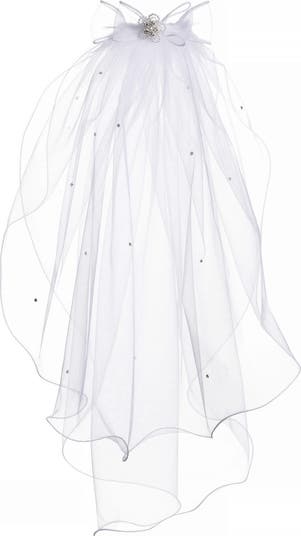A charming beaded brooch anchors an enchanting organza bow atop a cascading tulle veil with crystal accents for a sparkly touch.